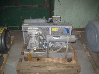 rotary screw single stage air compressor With a 120 gallon receiver. with air cooling The compressor is belt driven The skid has analog controls.