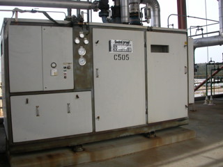 air cooled rotary screw compressor oil free This is a twin shaft screw compressor This is a twin shaft 55 psia @ 60 degrees F outlet pressure The compressor is a type WQ 40-12/55, 1.2 kg/cu M, 20 degrees C, 75 cuM/minute General Electric Extra Severe Duty AC motor The intake flange is 8" and discharge flange is 6" and both are mounted at the top of the machine, and the instrumentation for monitoring the unit are mounted on the side as a panel. This unit is mounted in complete sound proof enclosure.