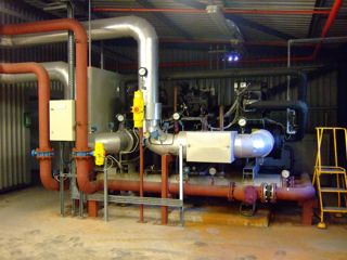 Dual direct drive semi-hermetic centrifugal compressors rated 0.45Kw/ton efficiency. Driven by (1) 893KW (LH Circuit) and (1) 946KW (RH Circuit) motors, 4160V, 60Hz, 3 Phase. Uses low pressure refrigerant to produce low refrigerant emissions. (R-123 Charge- LH 2650 lbs & RH 2650 lbs.) Maximum working pressure is 15 psi on both high and low sides. The condenser and evaporator have high efficiency tubing providing greater surface area. Packaged design with electronic controls employing the latest in technology for energy usage.