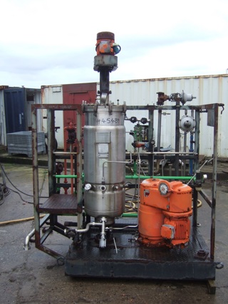 321 stainless steel jacket on straight side only, 4-blade turbine impellor, under belt driven by 7.5 kw, 3 phase, 50Hz, 380/660 volt, 1450/118/472 rpm SEW-Usocome geared motor, Burgmann mechanical seal, includes pipework, valves, filter, pump.