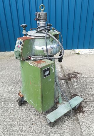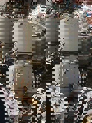 Trusioma high intensive mixer. Jacket rated 0.05 mPA. 2-tier 2-blade impellor. Total volume 1.0 cu M. Approx working capacity 400 to 600 liters. Top bolt cover with 1/3 hinged opening. 28-40 HP (22 to 30 KW), 3/50/220/380 volt, 740 to 1480 rpm XP motor thru gear reducer. Bowl 44.5 to 87 rpm. 200mm outlet w/manul gate valve.