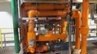 Pfaudler Thermal fluid (oil) loop system, all mounted inside a cabinet with pressure gauges, system consists of (1) HMD Magnetic drive centrifugal pump, manufactured by HMD Sealless Pumps Ltd, driven by 5.5 kw, 3/50/415 volt, 2900 rpm motor, (1) 60 liter electric heated tank, manufactured by Pfaudler Balfour, serial #500019, design pressure 10 barg @ 20/200 degrees C, electric heater manufactured by Heatex Ltd, serial #991433, 50kw, 3 phase, 415 volt, EEx d 11C T3, (2) stainless steel plate and shell heat exchangers, manufactured by Vahterus Oy, type PSHE-3HH80/1/1-HE-101 & PSHE-3HH60/1/1-HE-100, serial #6532 & #6531, design pressure on both sides 25 bar @ 200 degrees C, (1) 325 liter horizontal header tank, manufactured by Pfaudler-Balfour, serial #500019, design pressure 10 barg @ 20/200 degrees C, (1) 20 liter vertical tank, manufactured by Pfaudler-Balfour, serial #500019, design pressure 10 barg @ 20/200 degrees C, all items insulated