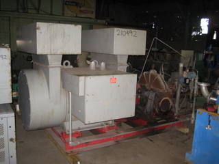 The Elliott gearbox reduces the turbine speed of 5750 RPM to a final speed of 1800 RPM to drive a conventional 4-pole, 2-bearing alternator rated 1000kW/1176kVA with 0.85 PF, 163 Amps and wound for 2400/4160V/3/60 Hz service.