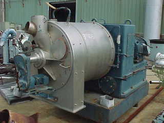 1000 mm product contact two stage pusher centrifuge Plant # 5101-0320-32 Basket diameter is 1032 mm, x 315 mm x 315 mm. (estimated inner basket of 932 mm) Main Drive Horsepower is 125, Rpm is 1800 With two stage washing Originally designed for maximum feed of 98,000 lbs./hr. of slurry, with 44,100 lbs./hr. of solids and 53,900 lbs./hr. of liquids. At 45 % wt. solids. Exit cake moisture of 6.0 wt.% or less. Vapor tight housing to +27.7” water and -13.8 “ water (vacuum) Book weight 8,900 kg. (19,621 lbs.)