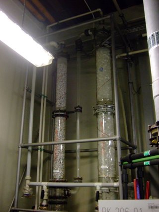 glass scrubber system consisting of (1) Schott QVF packed column, 165mm diameter x 2m high, (1) Schott QVF glass packed column, 225mm diameter x 2m high,