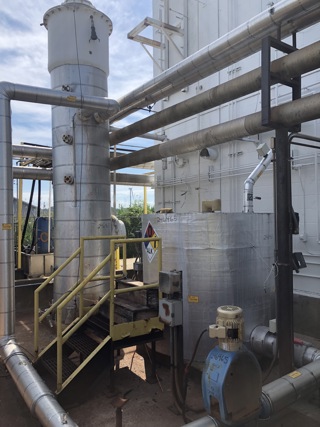 Vapors handled: NH3, N2, toluene vapor, 100 #/hr HCL, and 180 #/hr SOC12 vapor The system uses various recirculation streams depending on the vapors and removes 95-85% of the vapors depending on the conditions. The system utilizes CS construction for the tank and column, lined with “Flouroshield” Teflon, and also included are a recirculation pump and heat exchanger. The system design rating is FV/5 psig at 5-200 degrees F. The pump is a Gould’s size 1 x 1.5 x 8, model 3298, mag drive, and a Tefzel liner, driven by a 7.5 hp. Ex. Proof motor The heat exchanger is an APV Model SRS MS-12 with Hastelloy C-276 wetted parts and a surface area of 101.8 Sq.Ft. The column packing is Hi flow 5/8” rings manufactured from PFA Teflon, With an Otto York mist eliminator Complete package system base mounted on a CS base 9’ long x 7’ wide. Top of the column is 106” high.