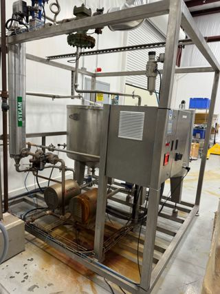 4000 Liter/Hr.(17 GPM) clean in place skid Skid contains the following major pieces, one condenser, two tanks, two pumps, and a on board control panel. Two 400 Liter tanks with open tops and welded slight cone bottoms.(Solution supply & return tanks) two sanitary centrifugal pumps by Inoxpa, and controls with a Siemens HMI. Heating capacity 4000 Liters/hr., Heat transfer area 0.9 m2, Temp rise 50 -60 degrees C, steam consumption per hour 80 kg/hr