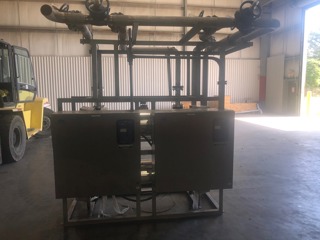 water booster and RO feed skid Contains the following equipment, one 7.5 HP 316 SS booster pump, close coupled, and base mounted, designed to increase the water pressure to 67 GPM for the RO system. One 5 micron rated pre filter contained in a 8" diameter x 24" high filter housing One Trantor Super Changer heat exchanger, 316 SS plates, 6 sq.ft., to increase water temperature to temper at 77 degrees F. One Aquafine UV Light, to reduce bacteria loading on the RO filter With digital controls and local control panel in a NEMA cabinet.